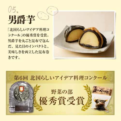 ・びっくり男爵:じゃがいも、昆布、砂糖、醤油、みりん、かんぴょう