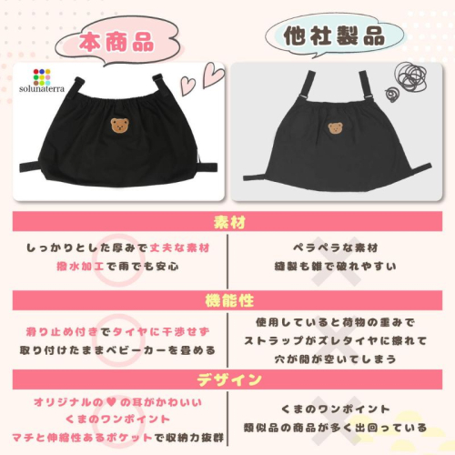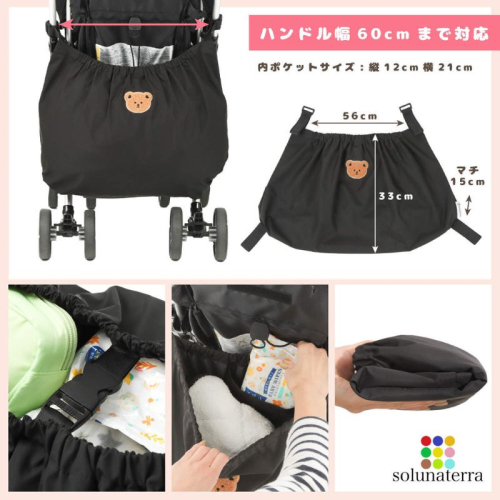ワンポイントのクマさんの刺繍がかわいい!ベビーカーの収納をサポートするアンダーバッグ。 重心が低いから、取っ手に引っ掛けるバッグと違い、転倒防止になります。 ベルトの滑り止め加工、マチ付きで大容量ながら、引きずりやタイヤへの巻き込まれを防止します。 便利な内ポケット付き。撥水加工で急な雨でも安心。 ベビーベッドのサイドバッグとして、お布団やぬいぐるみ等の収納にも大活躍! ●地場産品基準 3号:自社によるデザイン、生地、滑り止め加工、ポケット、サイズやマチの設計など企画立案・商品開発を区域内で行っている。検品工程、梱包工程を区域内の就労継続支援事業所にて行っている。在庫の保管・管理を区域内にて行っている。