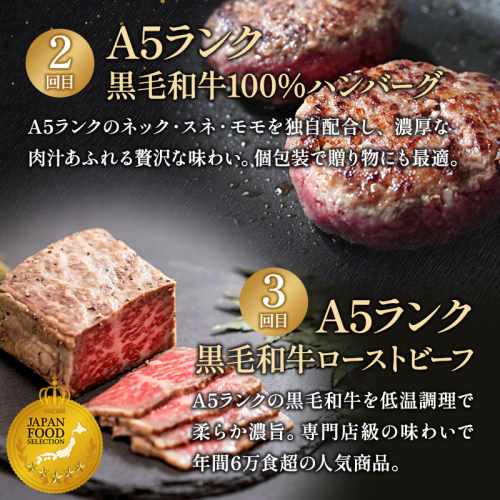 毎月届くのは、プロの審査会でも評価された黒毛和牛ローストビーフ、人気の牛タン3種食べ比べ、そしてA5黒毛和牛だけを使用した至極のハンバーグ。