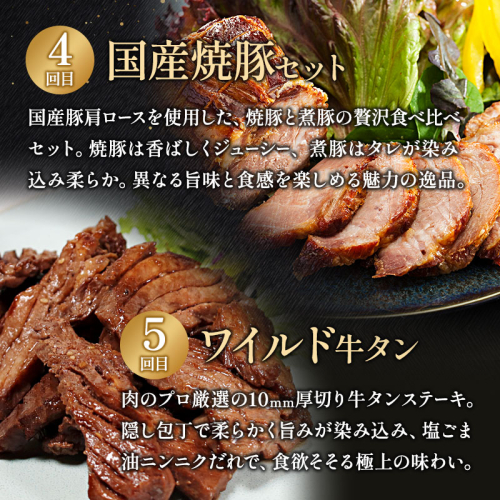 毎月届くのは、プロの審査会でも高く評価された黒毛和牛ローストビーフ、人気の牛タン3種食べ比べ、A5ランク黒毛和牛のみを使用した至極のハンバーグ、こだわりの国産焼豚・煮豚セット、食べ応え抜群のワイルド牛タン、そして累計25万食突破、1回目でもお届けした人気No.1黒毛和牛ローストビーフ。