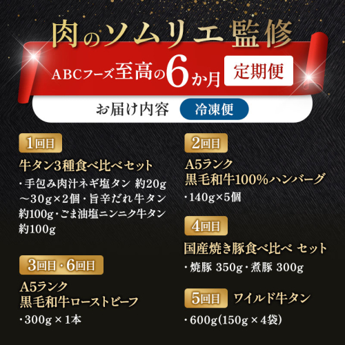 ABCフーズ肉のソムリエが選び抜いた A5黒毛和牛と厳選牛タン、焼き豚を使用した豪華6か月定期便です。毎月1回6ケ月(6回)の配送です。
