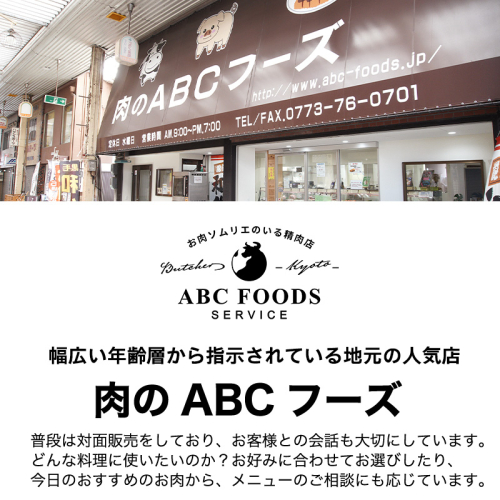 肉の消費量日本一の京都府に実店舗を構えるABCフーズは、お客様お一人ずつのお好みに合う肉をお届けできるよう、厳選した肉を心をこめて発送いたします。