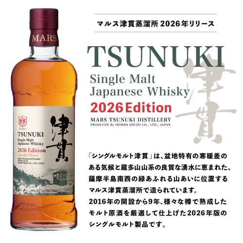 「シングルモルト津貫2026エディション」は、バーボンバレルやシェリーカスクを主体に様々な樽で熟成したモルト原酒をヴァッティングした2026年リリースのシングルモルトウイスキーです。