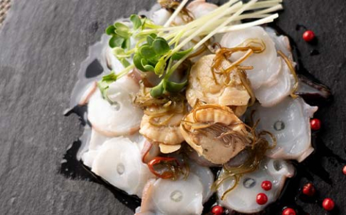 北海道・鹿部町の前浜で獲れたホタテを、白口浜真昆布とともにオリーブオイルで包み込んだ贅沢なアヒージョ。