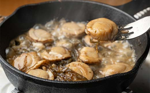 北海道・鹿部町の前浜で獲れたホタテを、白口浜真昆布とともにオリーブオイルで包み込んだ贅沢なアヒージョ。