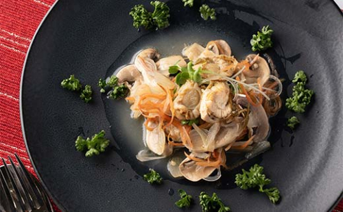 北海道・鹿部町の前浜で獲れたホタテを、白口浜真昆布とともにオリーブオイルで包み込んだ贅沢なアヒージョ。