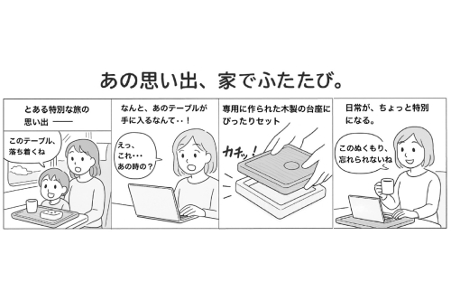 かつて特急車両として旅人を運び続けた座席前のテーブルを再生し、台座付きの埋め込み型カウンターテーブルとして再利用させたサステナブルな逸品。 列車がつないだ風景を、あなたの暮らしの中へ。 ■提供事業者:株式会社 丸國林業 【地場産品基準】 (5) 本返礼品の製造に関しては、原材料の加工・詰合せまでを全て区域内の店舗にて職人の手作りで行われております。