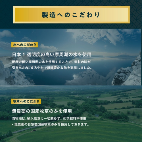 国産牧草にこだわりを持つ牧場主の愛情をたっぷりと受け、栄養価の高い牧草と※日本一透明度の高い摩周湖の伏流水を飲んで育つ牛たちの牛乳使ったこだわりの一品をお届けすることをお約束いたします。