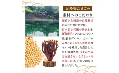●素材へのこだわり 超希少な国産の自然栽培(有機認証取得)の大豆を贅沢に使用。 日本名水百選の湧き水を大豆に浸水し、大豆本来のうまみや成分を逃さないよう、じっくり蒸しあげて作りました。 *安心素材で作る昔ながらの納豆 *大豆本来の甘みが感じられる納豆 ●免疫力×免疫力 霊芝とは、サルノコシカケ科に属するキノコの一種です。別名マンネンタケとも呼ばれています。 霊芝にはアミノ酸やβ-Dグルカン、カルシウムやリン、マグネシウム、カリウム、ナトリウム、鉄、銅、亜鉛、マンガンなどのミネラル類が含まれており、体内のバランスを正常に戻し、血液を浄化する働きが期待されています。 そんな霊芝を煮出した水分を大豆にたっぷり吸水させ、力強い納豆に仕上げました。 《原材料名》 有機大豆(国産)、有機鹿角霊芝 オーガニック納豆(有機JAS認証番号:1149) 《地産理由》 商品化する全ての工程を市内で行っているため 自然放牧場 お多福たまご 0995-74-2755