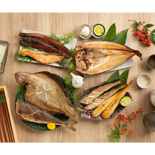一夜干し真ほっけ開き2 枚、一夜干しなめたかれい1 枚、ホッケおから漬け2 本、一夜干しサンマみりん3 枚、一夜干し姫たら5 本、八角丸干し300g、鮭西京風切身2 切
