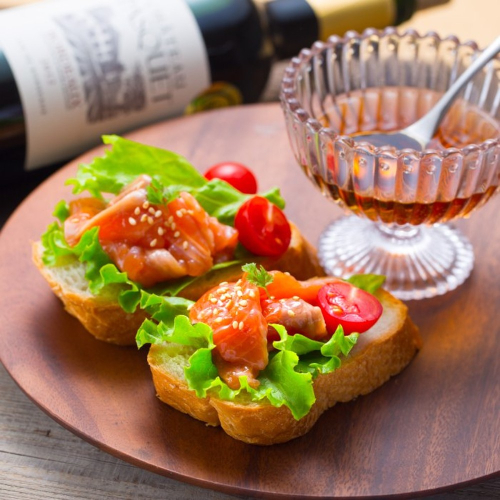 脂ののったサーモンを特製醤油タレに漬け込み、旨味豊かに仕上げました。スモーク風味が口いっぱいに広がります。