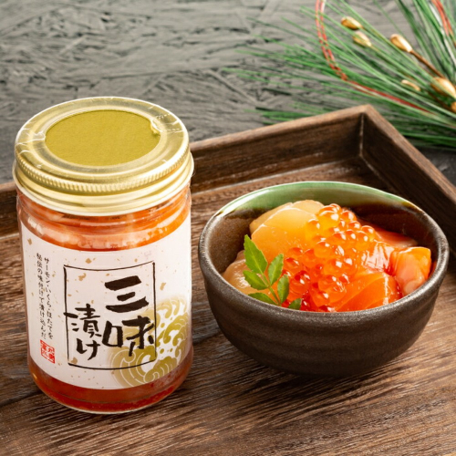 【三味漬け】いくら醤油漬け、特製タレに漬け込んだ鮭、丁度良い大きさのホタテを、三層に詰め見た目にもお楽しみいただけます。1瓶で北海道の海の幸がギュッと詰まってます。