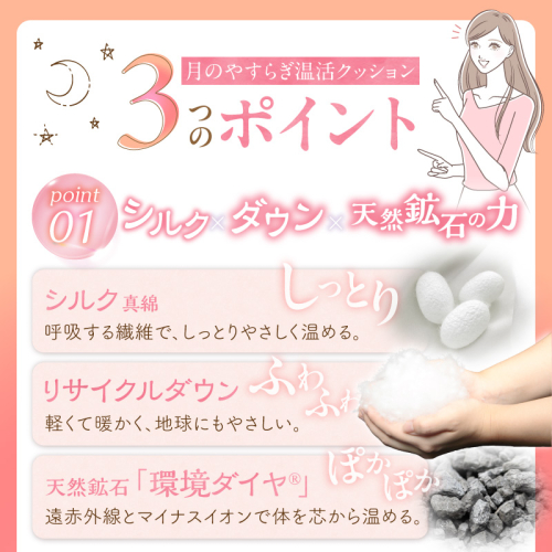 真綿のしっとり感、ダウンのふわふわ感、天然鉱石の温熱効果を組み合わせた“三日月型クッション”。