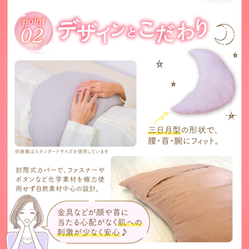 - 【ネムケア フェムクッション】スタンダードサイズ 女性のからだにやさしい天然素材クッション フェムケア フェミケア 温活 保温 女性 やすらぎ 睡眠 シルク 腰当て 首枕 抱き枕 三日月型 H162-044