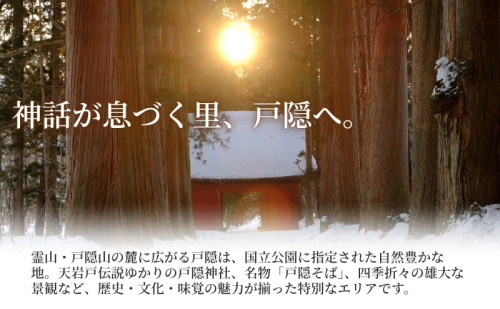 妙高戸隠連山国立公園内に位置する戸隠は、戸隠神社をはじめ悠久の歴史と、日本三大そばの一つに数えられる戸隠そばを代表とする食文化や壮大な自然が息づく特別な場所です。是非戸隠に宿泊し、戸隠を満喫してください。