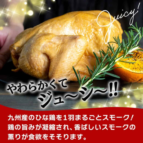 !!こちらは訳ありの返礼品です!! 品質に問題はございませんが、在庫過多により、訳あり品としてご提供いたします。 賞味期限は2026年11月11日です。 必ず確認・ご了承いただいた上、お申し込みください。 ※「訳あり品」としてご提供いたしますので、返品交換は対応しかねます。 九州産のひな鶏を1羽まるごとスモークしました!鶏の旨みが凝縮され、香ばしいスモークの薫りが食欲をそそります。 柔らかくジューシーなチキンをご堪能ください!! ※お召し上がり方を記したリーフレットを同梱しております。 ※ひな鶏スモークチキン:食品表示ラベル上の原産地表記が国産となっていますが、内容物は九州産を使用しております。