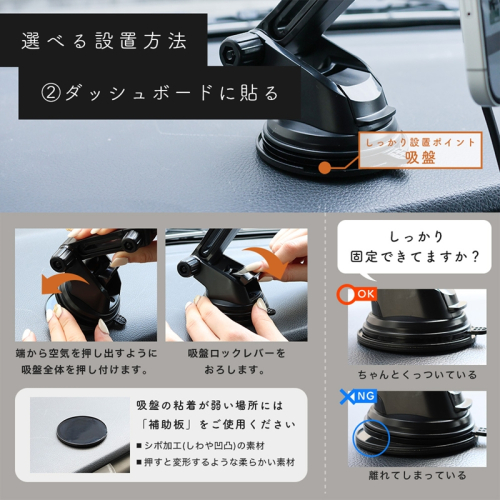 片手で簡単にセット、取り外しができ、運転中の揺れや振動でもスマホが落下しない強力な磁力で固定できます。