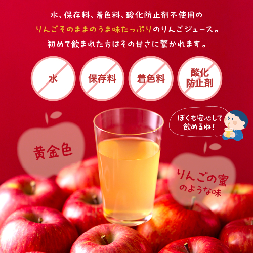 水も不使用、保存料・着色料不使用のりんごの蜜のような味。初めて飲まれた方は甘さに驚かれます。りんごジュースには酸化防止剤を使用してないため、黄金色に仕上がっています。