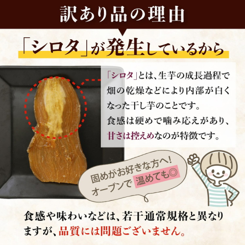 「シロタ」とは、生芋の成長過程で畑の乾燥などにより内部が白くなった干し芋のことです。食感は硬めで噛み応えがあり、甘さは控えめなのが特徴です。 品質的には全く問題がありません。硬さが気になる場合は、オーブントースターで1~2分温めると、柔らかく風味が増します。