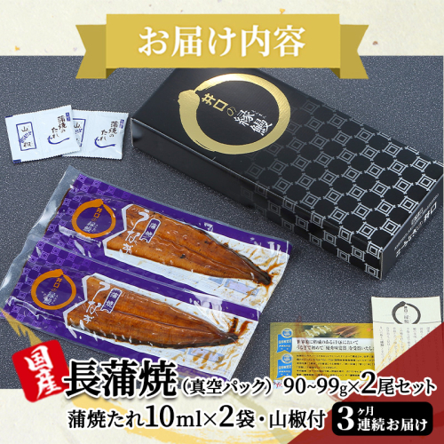 - 【定期便3回】訳あり 国産うなぎ長蒲焼(90~99g)2尾セット ITI優秀味覚賞受賞 たれ・山椒付き ウナギ 鰻 静岡 浜松市 【配送不可:離島】