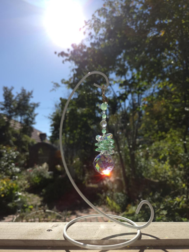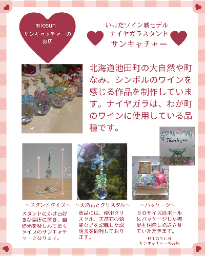 窓際に置くだけで、日差しが当たるたびにクリスタルがきらめき、虹玉が部屋いっぱいに広がります。皆さんをやさしさに包み込む癒しのインテリアアクセサリーです。北海道池田町で作られるワインや美しい景色をモチーフに生み出された愛が詰まった返礼品です。天然石とクリスタルを使用し、おひとつおひとつ丁寧に手作業で作り上げていますので、心も体も癒されるそんな素敵な時間をお楽しみください。