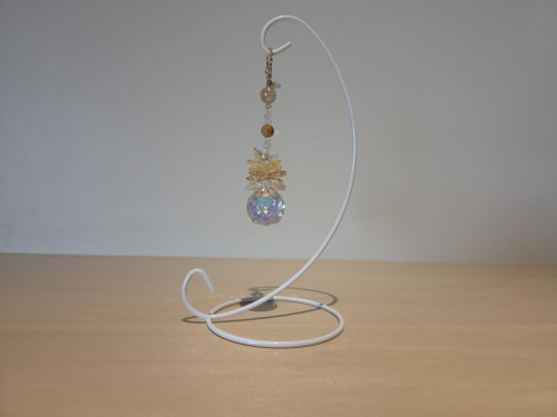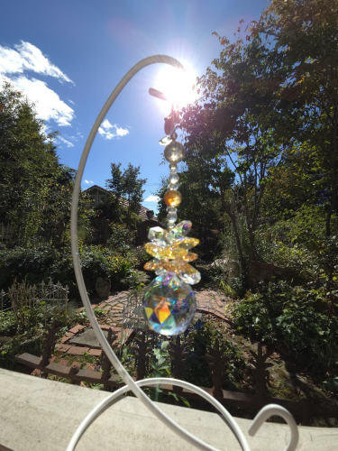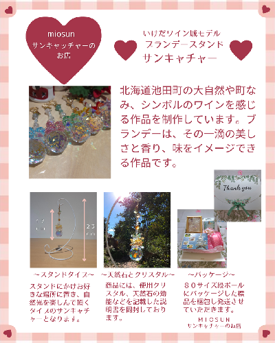 窓際に置くだけで、日差しが当たるたびにクリスタルがきらめき、虹玉が部屋いっぱいに広がります。皆さんをやさしさに包み込む癒しのインテリアアクセサリーです。北海道池田町で作られるワインや美しい景色をモチーフに生み出された愛が詰まった返礼品です。天然石とクリスタルを使用し、おひとつおひとつ丁寧に手作業で作り上げていますので、心も体も癒されるそんな素敵な時間をお楽しみください。