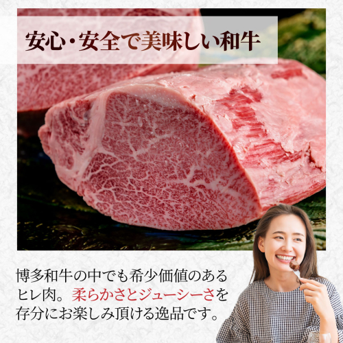 こちらは「博多和牛」品種のヒレ肉です。福岡県の限定生産者として登録された約50戸の農家が、大切に育て上げています。 博多和牛の中でも希少価値のあるヒレ肉を、ステーキにすると、柔らかさとジューシーさを存分にお楽しみ頂ける逸品です。濃厚な旨みが口中に広がります。 【地場産品基準に該当する理由】 8ハ|博多和牛 都道府県が当該都道府県の区域内の複数の市区町村において地域資源として相当程度認識されている物品及び当該市区町村を認定し、当該物品を当該市区町村がそれぞれ返礼品等とするもの