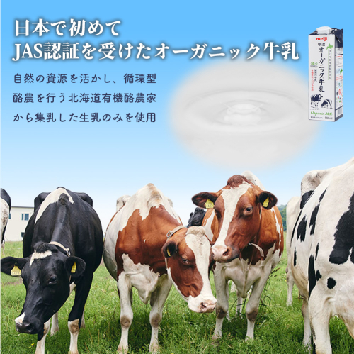 「明治オーガニック牛乳」は、農薬や化学肥料などの化学物質に頼らないことを基本として自然界の力で生産された食品を表す、有機JAS規格(農林水産省)の認証を取得している牛乳です。北海道網走郡津別町にある指定牧場で、有機農業の考え方に基づき飼育された乳牛から搾った生乳のみを使用しています。