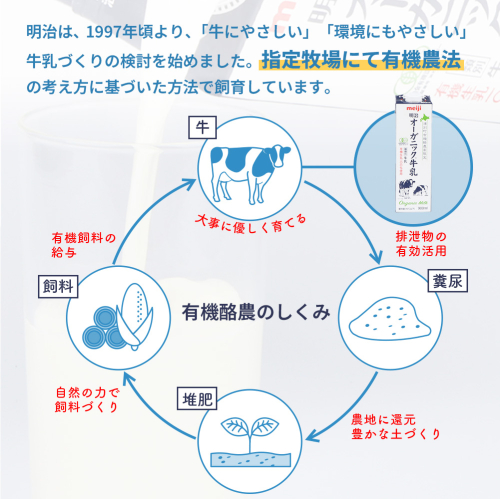 「明治オーガニック牛乳」は、農薬や化学肥料などの化学物質に頼らないことを基本として自然界の力で生産された食品を表す、有機JAS規格(農林水産省)の認証を取得している牛乳です。北海道網走郡津別町にある指定牧場で、有機農業の考え方に基づき飼育された乳牛から搾った生乳のみを使用しています。