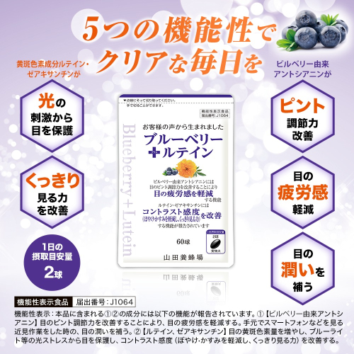 「ブルーベリー+ルテイン 」は、ビルベリー由来のアントシアニン、ルテイン、ゼアキサンチンを配合した商品です。