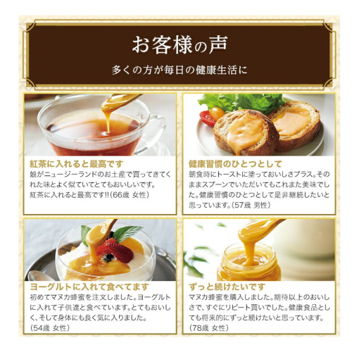 特有の香りと、濃厚でコクのある味わいのマヌカ蜂蜜を、クリーム状にすることでまろやかでキャラメルのような食感に仕上げた商品です。