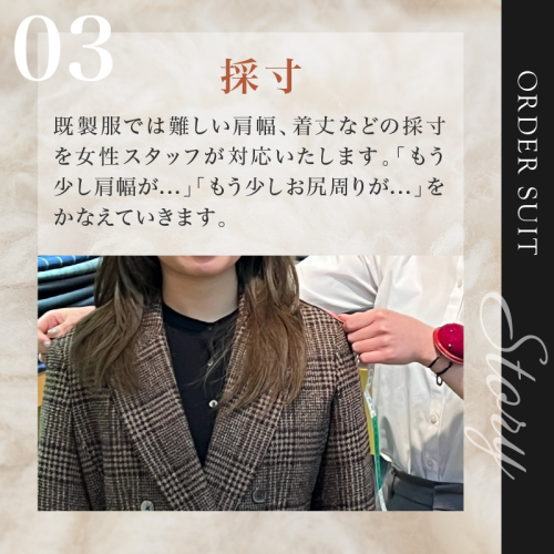 ●店舗まで採寸にお越しいただくことが難しい場合は、スーツをお送りいただくことでの採寸も可能。