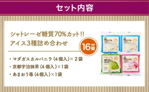 【シャトレーゼ】 糖質70%カット!!アイス3種詰め合わせ (バニラ・苺・抹茶) マダガスカルバニラ ・ 京都宇治抹茶 ・ あまおう 苺 計16個(各4個)