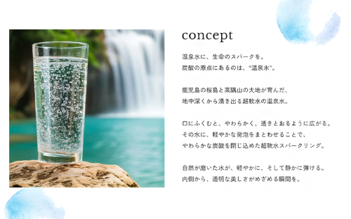 鹿児島・桜島と高隅山の大地が育んだ、地中深くから湧き出る硬度1の超軟水・温泉水をベースに、きめ細やかで軽やかな発泡をまとわせることで、やわらかな炭酸を閉じ込めた、超軟水スパークリング。