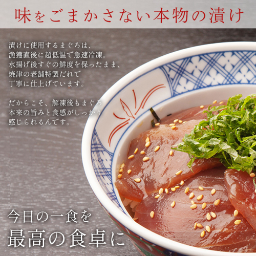 【説明】創業100年を超える焼津の老舗が手掛ける“特製だれ”で、キハダマグロをじっくりと漬け込みました。 しょうゆベースにかつおだしの旨みを加えた「甘めの味付け」は、白ごはんとの相性抜群。ご家庭で、まるで専門店の“マグロ漬け丼”を楽しめます。