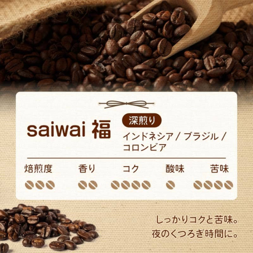 - saiwai 福(深煎り):しっかりとしたコクと苦味。夜のくつろぎ時間やスイーツと一緒に