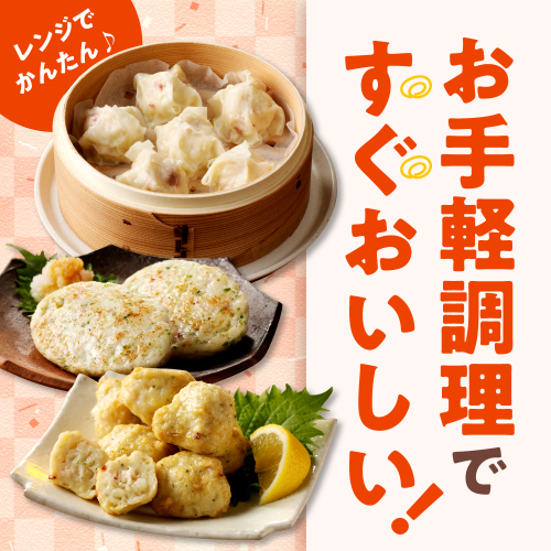 えりも産タコしゅうまい:タコ(北海道えりも産)、魚肉すり身(タラ(北海道産)、砂糖)、野菜(キャベツ(日本)、生姜)、植物油脂(大豆油、菜種油)、食塩、卵、醸造酢(小麦を含む)、砂糖、皮(小麦粉)/加工デンプン、調味料(アミノ酸等)、香辛料抽出物