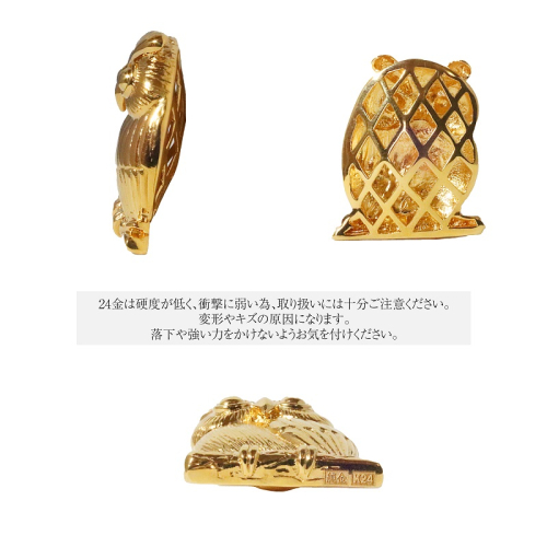 ふくろうは「福が来る」、 昔から縁起の良い物と言われています。 純金を約13g使用。 枝にちょこんと乗っている姿を再現しました。 自立不可なデザインになっています。 顔や表面など細かい所まで再現しました。 裏側には「純金」「K24」の刻印 純金約13g 手作りの過程もある為重さは約になりますが、 13gを下回ることはありません。 ———注意事項——— 純金は硬度が低く、衝撃に弱いため キズや変形にはお気を付けください。 返礼品がお手元に届きましたら、問題がないか早急にご確認をお願い致します。 一品一品丁寧にお作り致しますので 発送までにお時間をいただく場合があります。 手作りの過程もございます。 色味や表情等に個体差があるため、 画像と若干の違いがでる場合があります。 ご了承ください。 TPUフィルムが張ってあるプラスチックケースで発送致します。 ケースは予告なくデザインが変更になる場合があります。