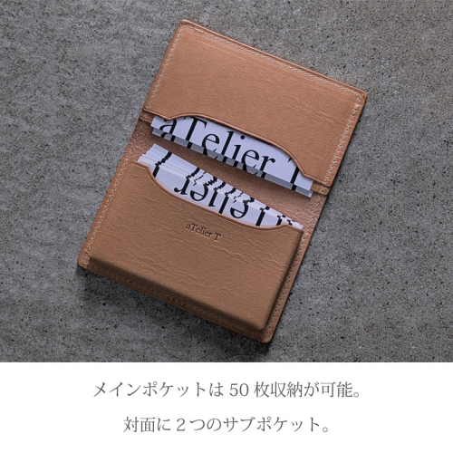 メインのポケットは最大50枚収納が可能で、対面に2つのサブポケットを設けております。