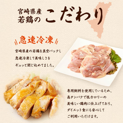 宮崎県産の若鶏を真空パックし、急速冷凍して美味しさをギュッと閉じ込めました。 専用飼料を使用しているため、高たんぱくで低カロリーの美味しい鶏肉に仕上げており、ダイエット食にも安心してご利用いただけます。