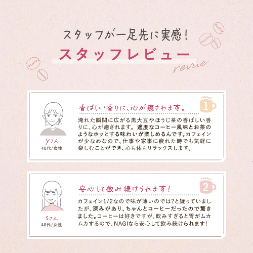 NAGIに使用しているコーヒーは、特許取得の発酵技術でカフェインを1/2に減らした「発酵コーヒー」を使用しています。