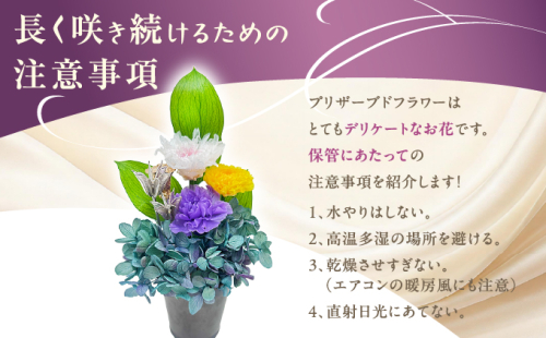 花材と葉材は国内製造のプリザーブド加工とドライ加工されたものだけを厳選した、自然な風合いと清らかさにこだわって仕上げた国産・高品質のプリザーブドフラワーの仏花。