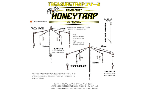 TREASURETRAP シリーズ「ハニートラップ」バマストモデル ハニートラップはトレジャートラップシリーズをバマストモデルとしてカスタムチューンしたバージョンになります。 バマストに必要な群れ感とワームのローリング&フラッシングを強調させるためにカスタムロングアームを8本追加しました。 さらにワームの取り付けを簡単にするために「マルチスプリング」を搭載!