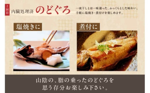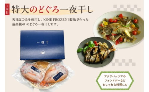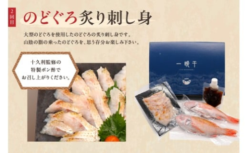 天日塩のみを使用し、「ONE FROZEN」製法で作った最高級ののどぐろ一夜干し、大型のどぐろを使用したのどぐろの炙り刺し身、手軽に塩焼き・煮付けを楽しめるように鱗と内臓を処理したまるまると太ったのどぐろ、当社ののどぐろ商品3種類を二ヶ月にわたってお届けします。