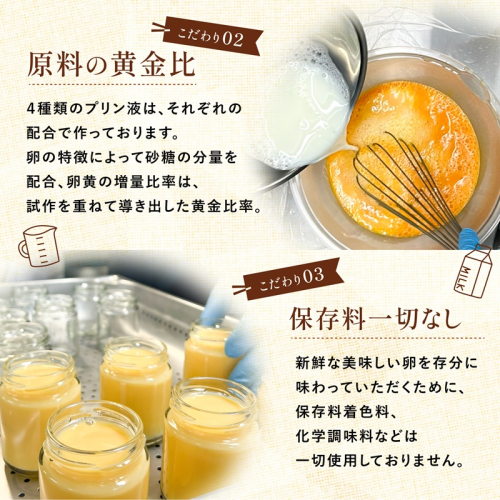 【説明】富士山麓の自然豊かな環境で育まれた新鮮な卵だけを使用し、特別なプリンをつくりました。卵本来のおいしさや個性がしっかりと伝わるよう、一つひとつ丁寧に向き合っています。プリンは全部で4種類。それぞれ卵の種類によって食感や濃度、香りが少しずつ異なり、それぞれに個性と奥深さがあります。