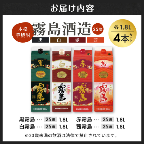 霧島酒造「赤・茜・黒・白」パック(25度)1.8L×4本_22-19-006