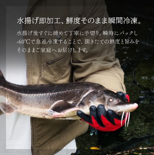 世界でも稀な特徴を持つ長野県長和町の名水「黒耀の水」で育まれたチョウザメのお肉は臭みが無く、強い旨味と上質な脂を感じられます。