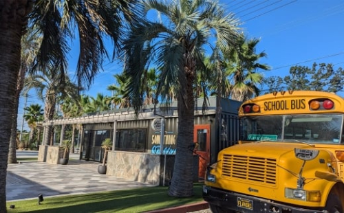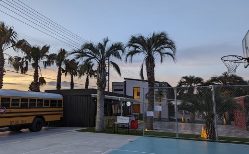 エリア内にはヤシの木、バスケットコート、外国風スクールバス、
