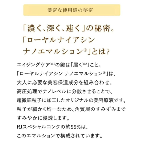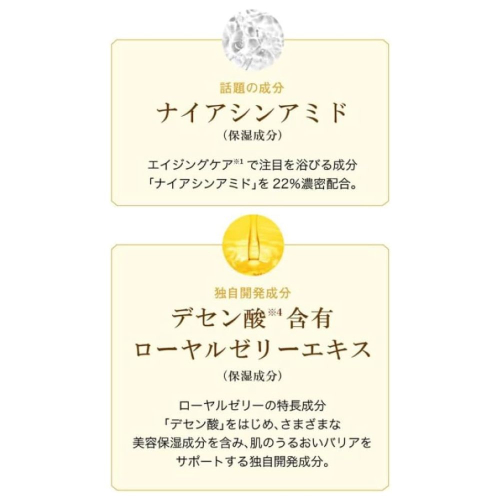 高濃度配合した「ナイアシンアミド」に「デセン酸含有ローヤルゼリーエキス」と「7つの美容保湿成分」をひとつに凝縮した濃厚な感触のエイジングケア美容液です。