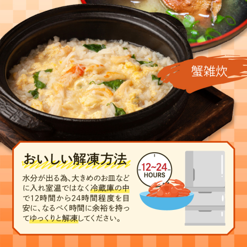 水分が出る為、大きめのお皿などに入れ室温ではなく12時間から24時間程度を目安に、なるべく時間に余裕を持って冷蔵庫の中でゆっくりと解凍してください。急速冷凍を行っているので、茹でたてに近い状態のセイコ蟹をお好きな時に食べられます!!